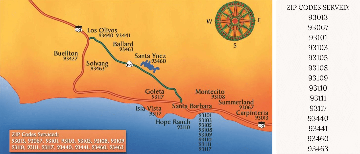 The following map lists the areas and zip codes that fall within the Santa Barbara and Santa Ynez Multiple Listing Services. It is an area that we are comfortably and effectively service within a 30 mile, 30 minute radius.